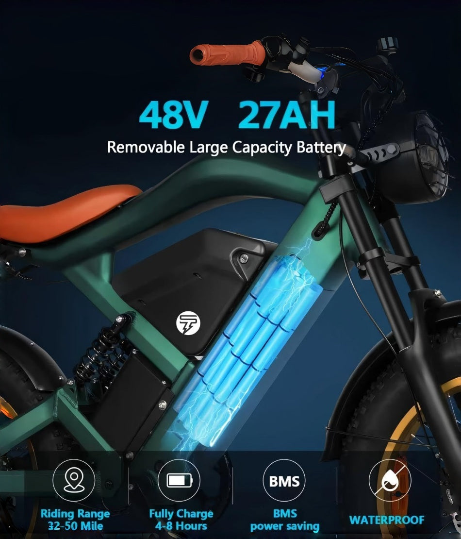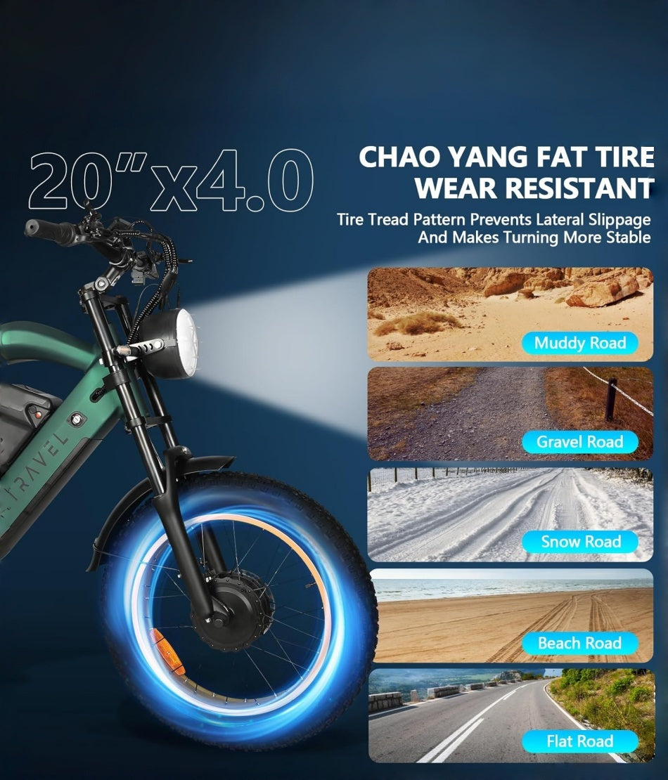 - Off-road/mountain e-bikes: Feature fat tires (4.0-inch width), front/rear hydraulic disc brakes, and full suspension (120-150mm travel), capable of tackling steep slopes (≤25°), rocky trails, and muddy terrain.Check the "Terrain Compatibility" section on each product page for details.