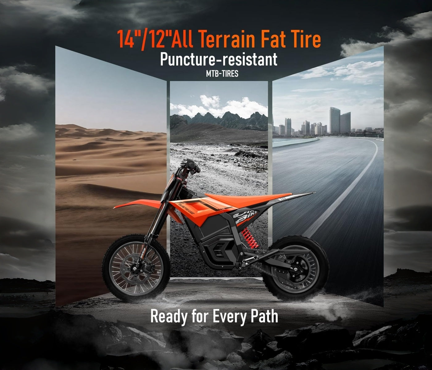 - Off-road/mountain e-bikes: Feature fat tires (4.0-inch width), front/rear hydraulic disc brakes, and full suspension (120-150mm travel), capable of tackling steep slopes (≤25°), rocky trails, and muddy terrain.Check the "Terrain Compatibility" section on each product page for details.