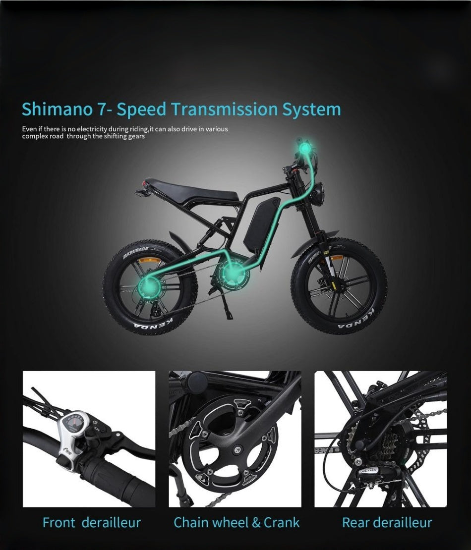 - Off-road/mountain e-bikes: Feature fat tires (4.0-inch width), front/rear hydraulic disc brakes, and full suspension (120-150mm travel), capable of tackling steep slopes (≤25°), rocky trails, and muddy terrain.Check the "Terrain Compatibility" section on each product page for details.