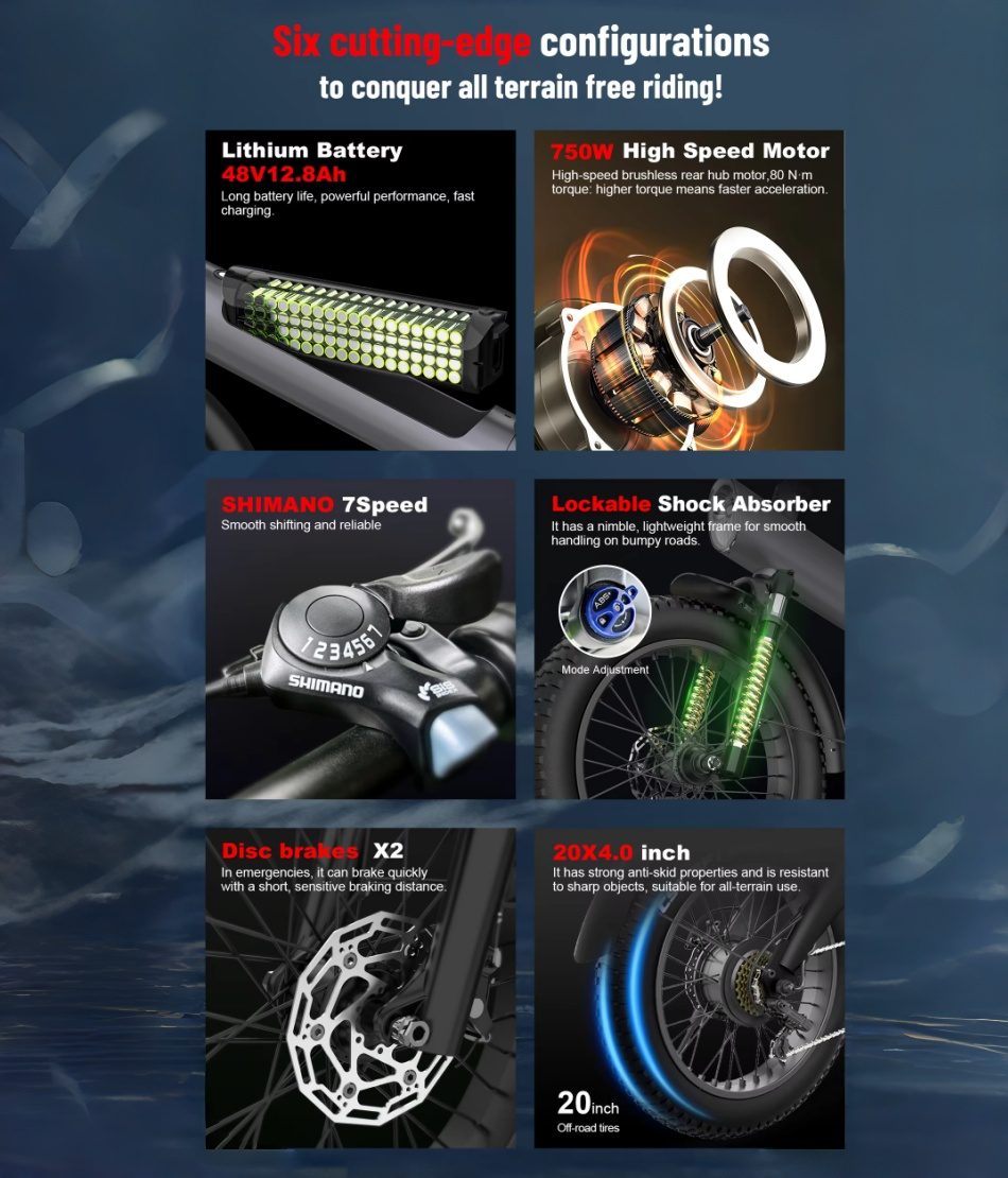 - Off-road/mountain e-bikes: Feature fat tires (4.0-inch width), front/rear hydraulic disc brakes, and full suspension (120-150mm travel), capable of tackling steep slopes (≤25°), rocky trails, and muddy terrain.Check the "Terrain Compatibility" section on each product page for details.