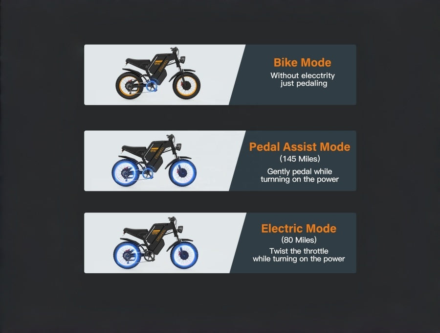 - Off-road/mountain e-bikes: Feature fat tires (4.0-inch width), front/rear hydraulic disc brakes, and full suspension (120-150mm travel), capable of tackling steep slopes (≤25°), rocky trails, and muddy terrain.Check the "Terrain Compatibility" section on each product page for details.